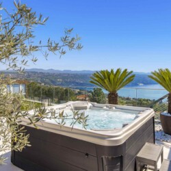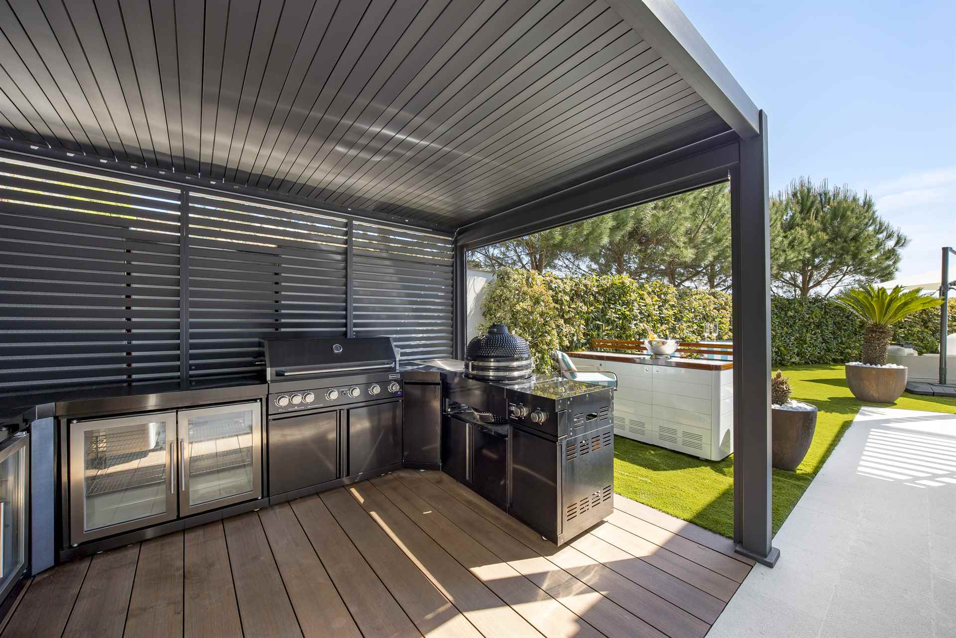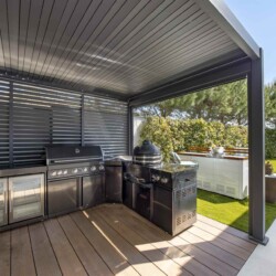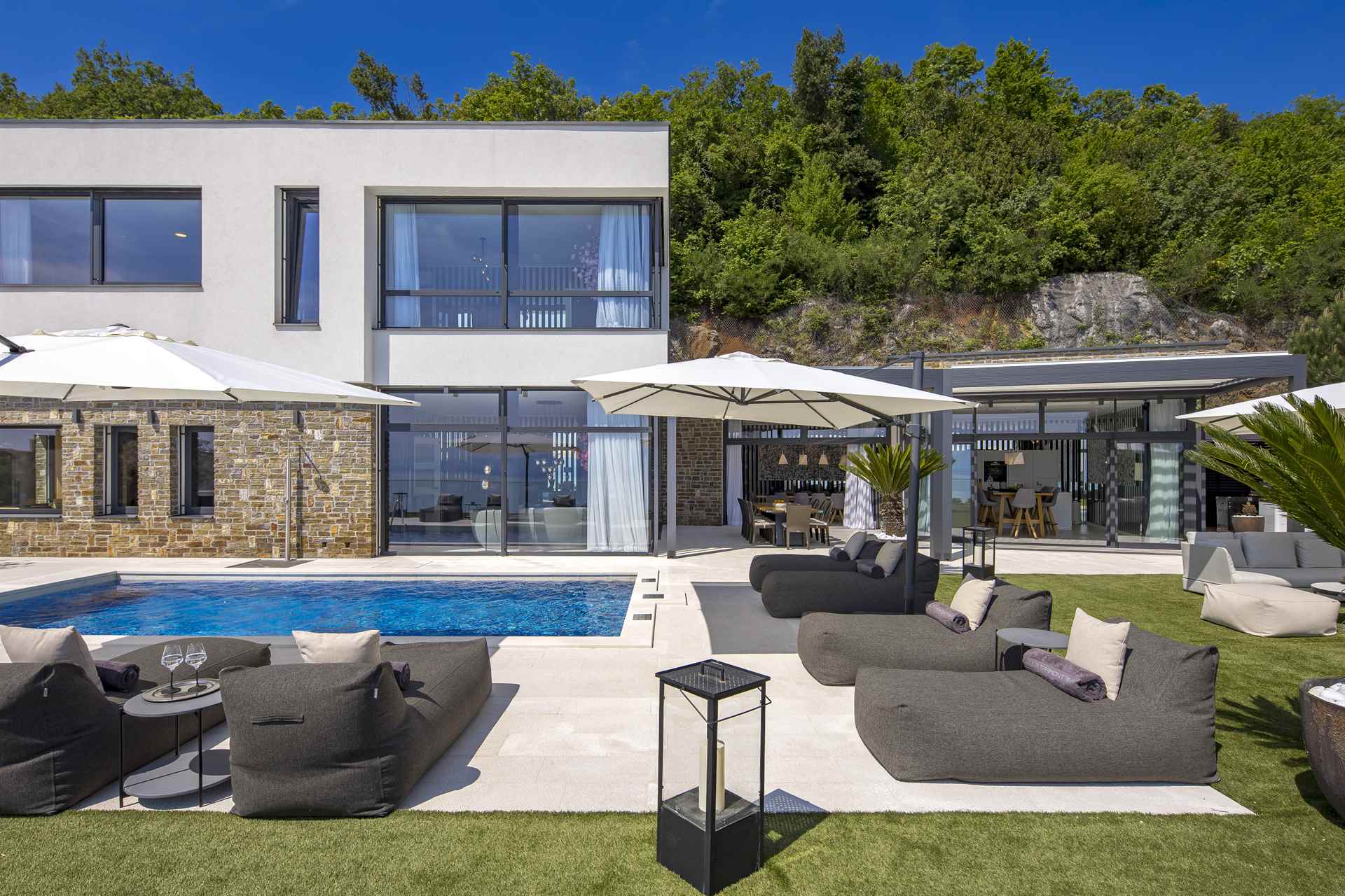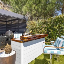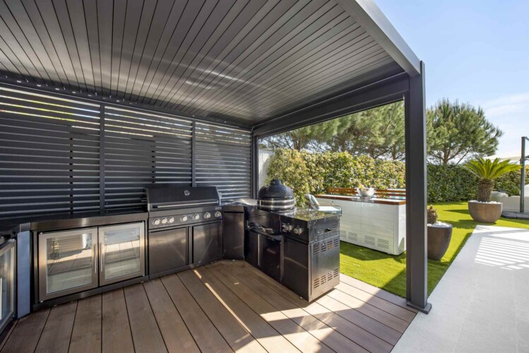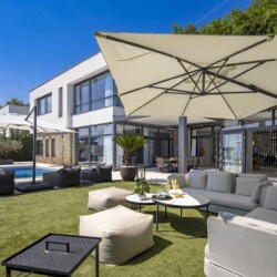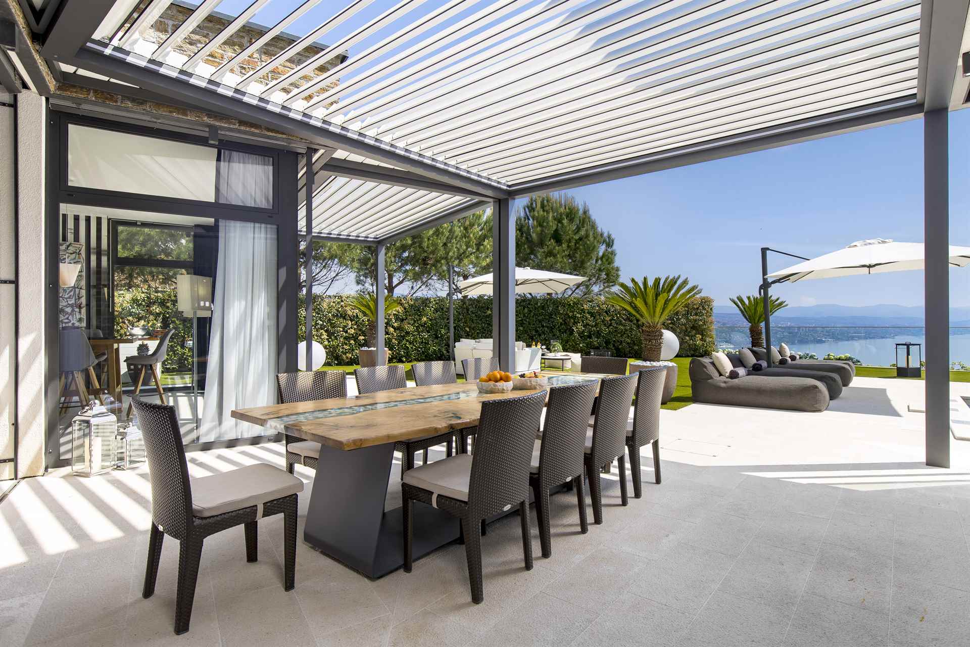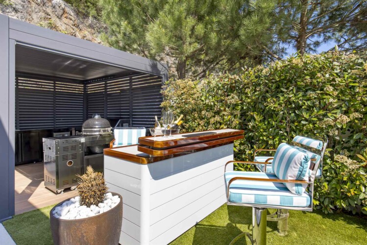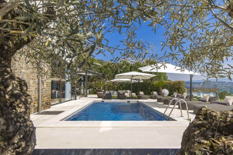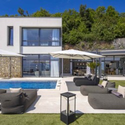 Im Zentrum des Außenbereichs befindet sich ein stilvoller Swimmingpool mit Meerblick, umgeben von bequemen Liegestühlen und Sonnenschirmen – ideal zum Entspannen. Daneben wartet eine voll ausgestattete Außenküche mit Bar und Grill, perfekt für gesellige Abende unter dem Sternenhimmel.