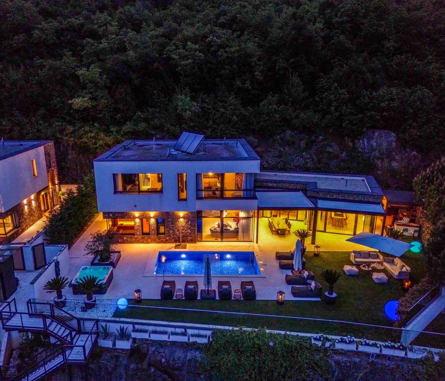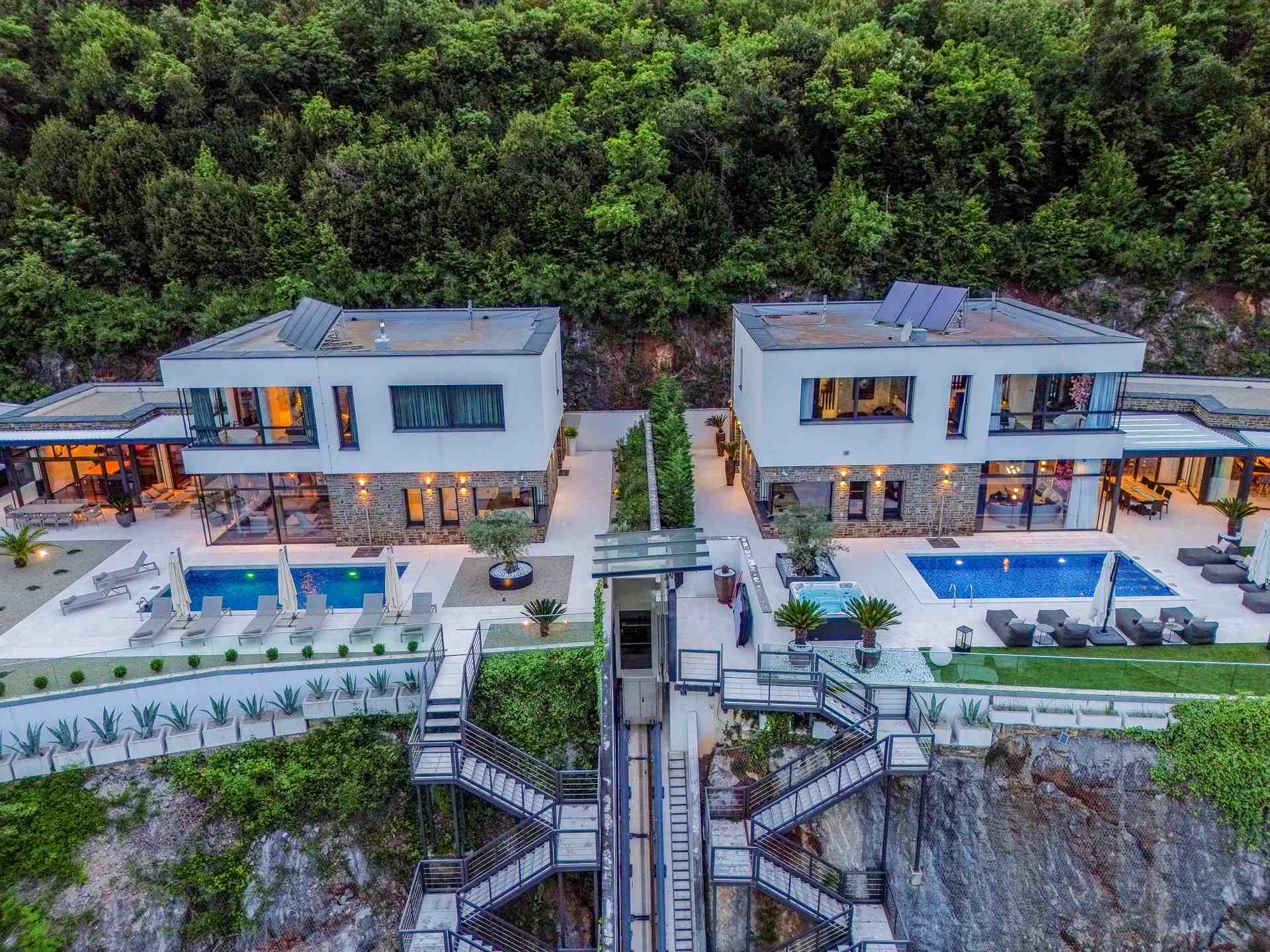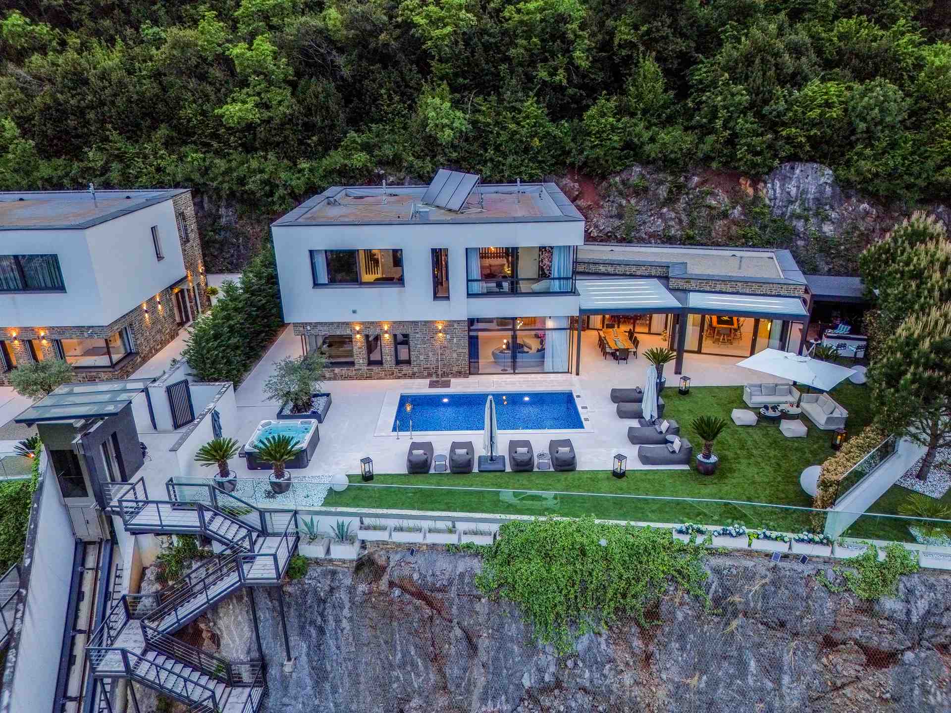 Ein privater Aufzug bringt Sie direkt vom gesicherten Parkplatz (2 Stellplätze) zur Villa – bereits während der Fahrt eröffnet sich ein traumhafter Blick auf die Kvarner Bucht. Schon beim Betreten spürt man die Exklusivität und absolute Privatsphäre – niemand kann Sie sehen, doch Sie sehen alles.