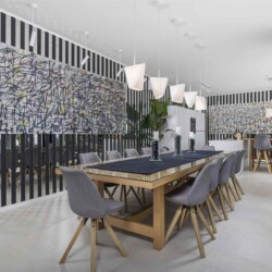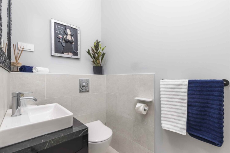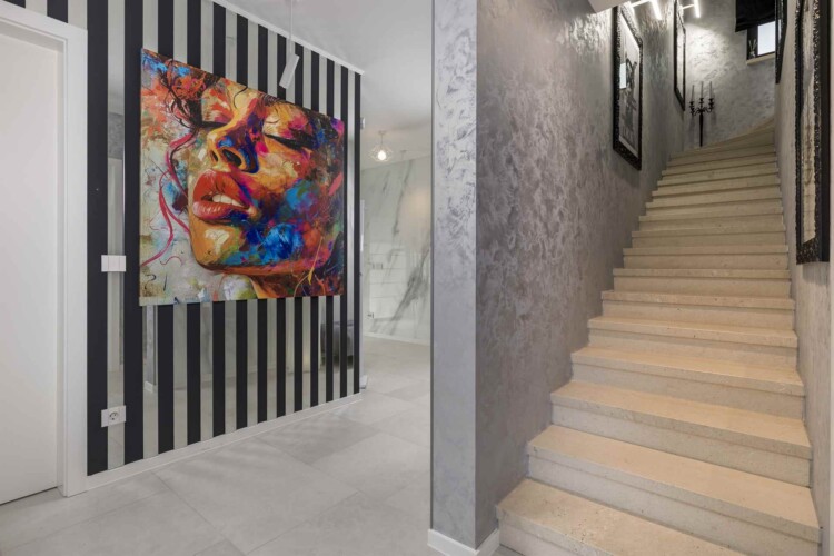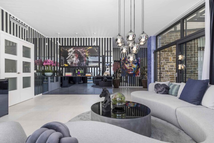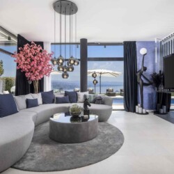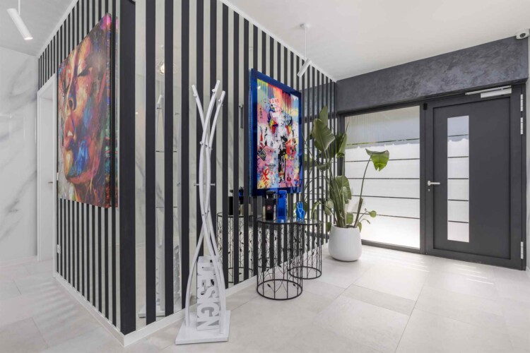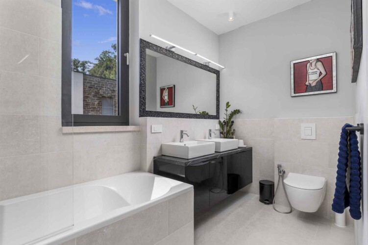 Das Interieur der Villa ist eine sorgfältige Komposition aus modernem Design und kunstvoller Auswahl – jedes Bild an der Wand wurde bewusst gewählt, einige stammen sogar von bekannten Künstlern. Die Fußbodenheizung sorgt in jedem Raum individuell für perfekte Temperatur – das ganze Jahr über.