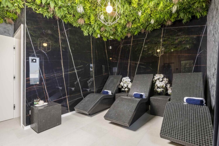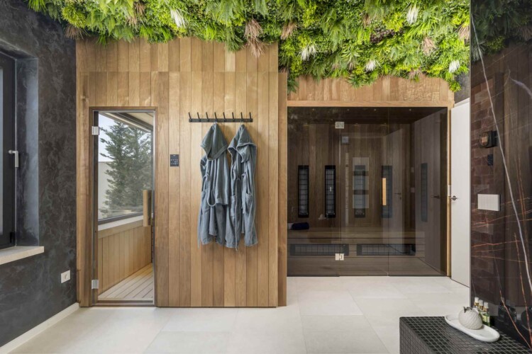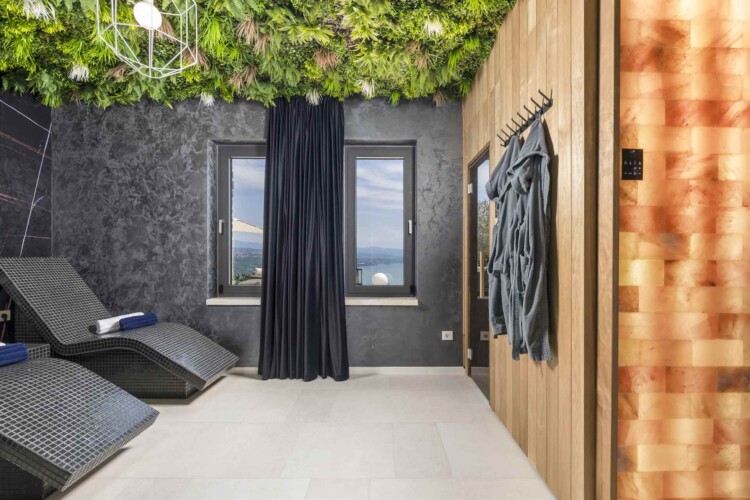 Für ein vollendetes Wellness-Erlebnis stehen ein Außen-Whirlpool sowie ein exklusiver Spa-Bereich mit finnischer und Infrarot-Sauna zur Verfügung – gelegen unter einer stilvoll gestalteten Decke mit realistisch wirkendem grünen Dekor und Meerblick. Die Wände sind mit luxuriösem Marmor verkleidet, und jeder Winkel wirkt wie aus einem Hochglanz-Lifestyle-Magazin.