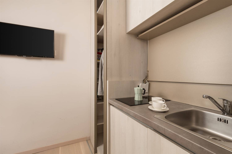 This studio Apartment fits perfectly 2 persons – a bedroom + working desk, kitchenette and an adoring bathroom. Hotel room look a like.