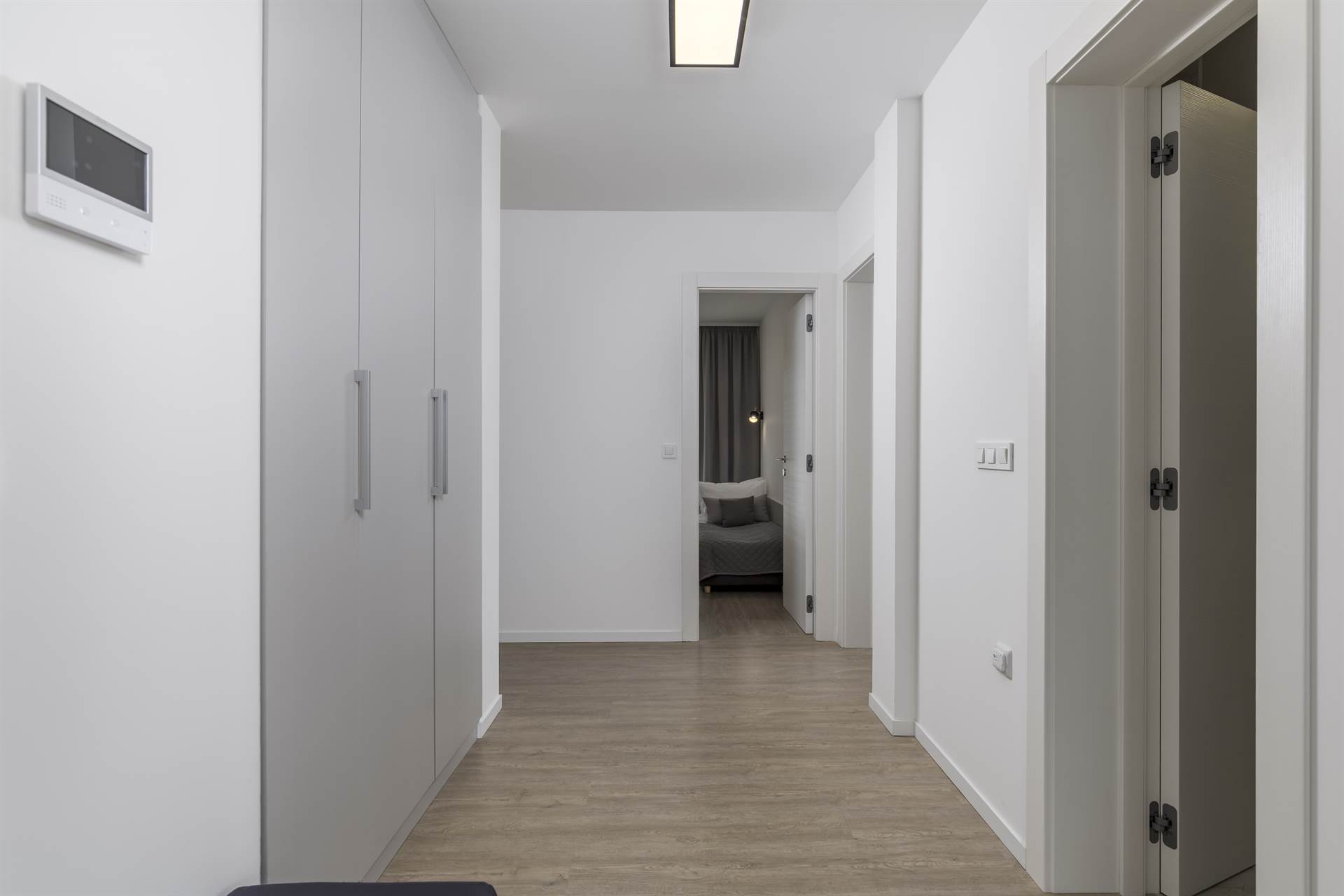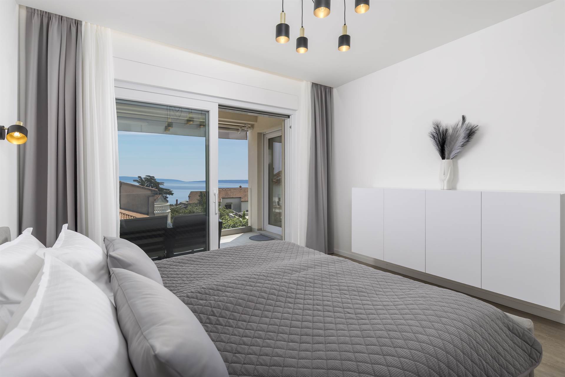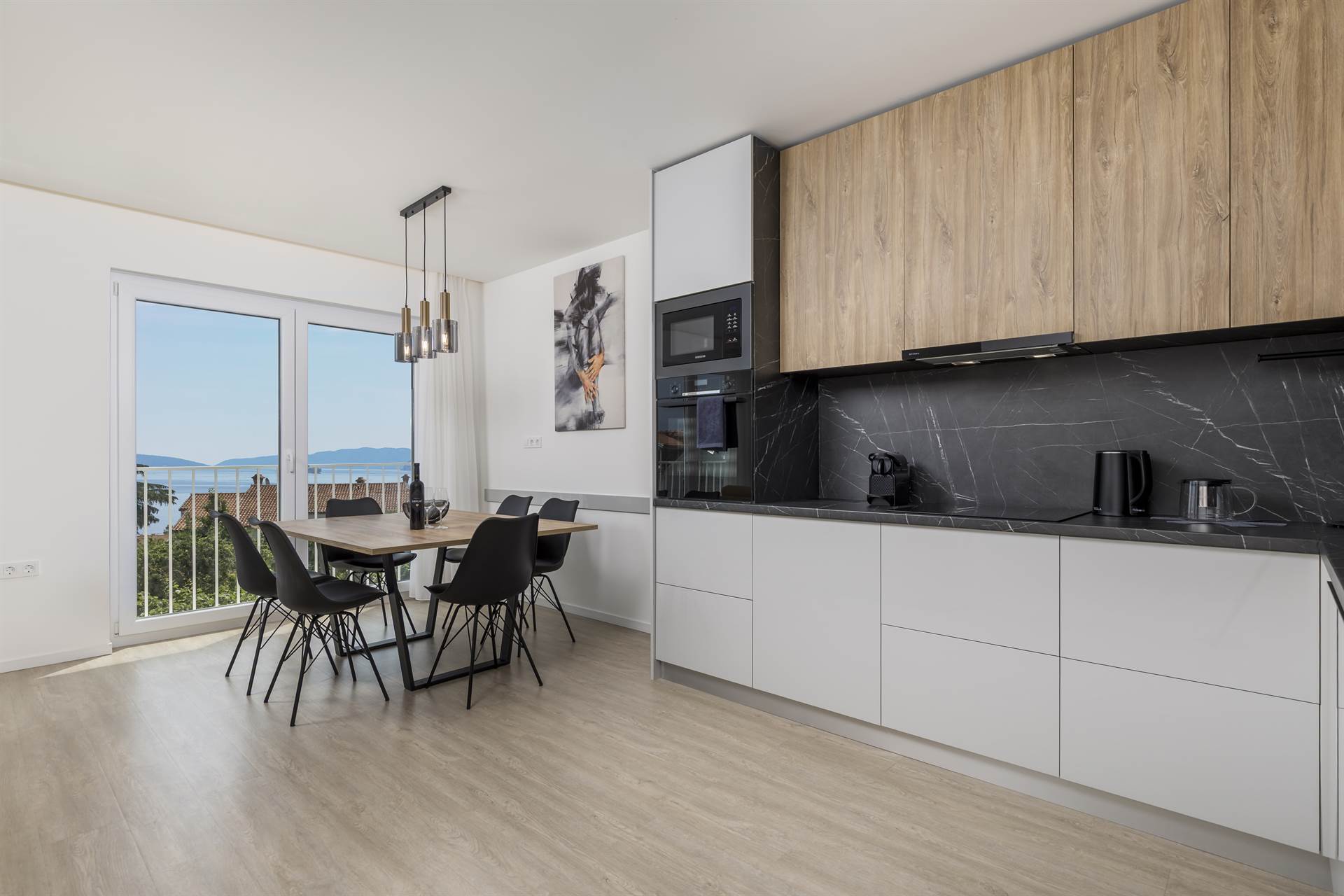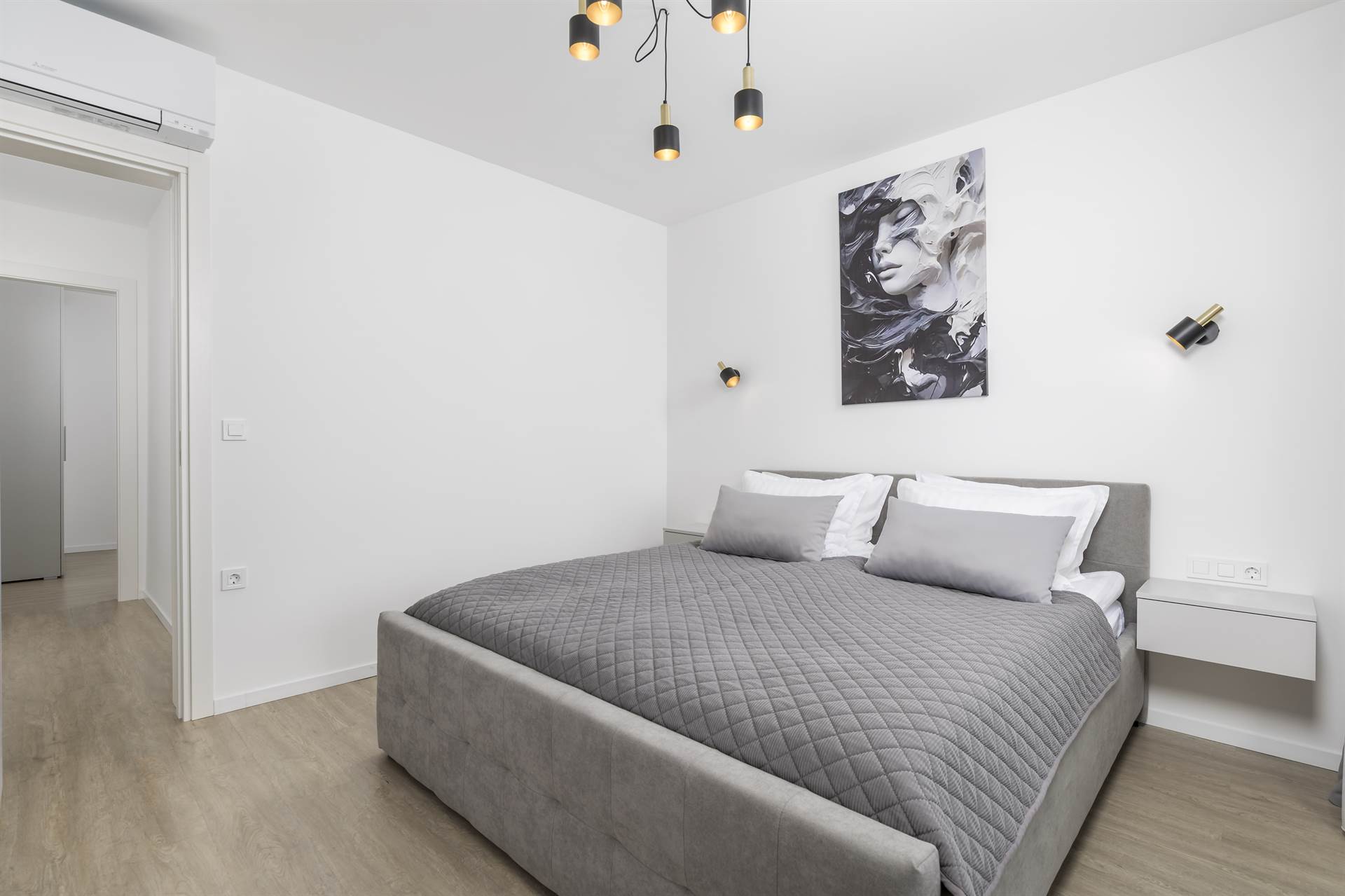 Nekretnina raspolaže s tri spavaće sobe, dvije moderno uređene kupaonice, otvorenim dnevnim boravkom povezanim s kuhinjom i blagovaonicom, te terasom s koje se pruža pogled na more. Apartman je dizajniran s naglaskom na suvremeni stil i udobnost.