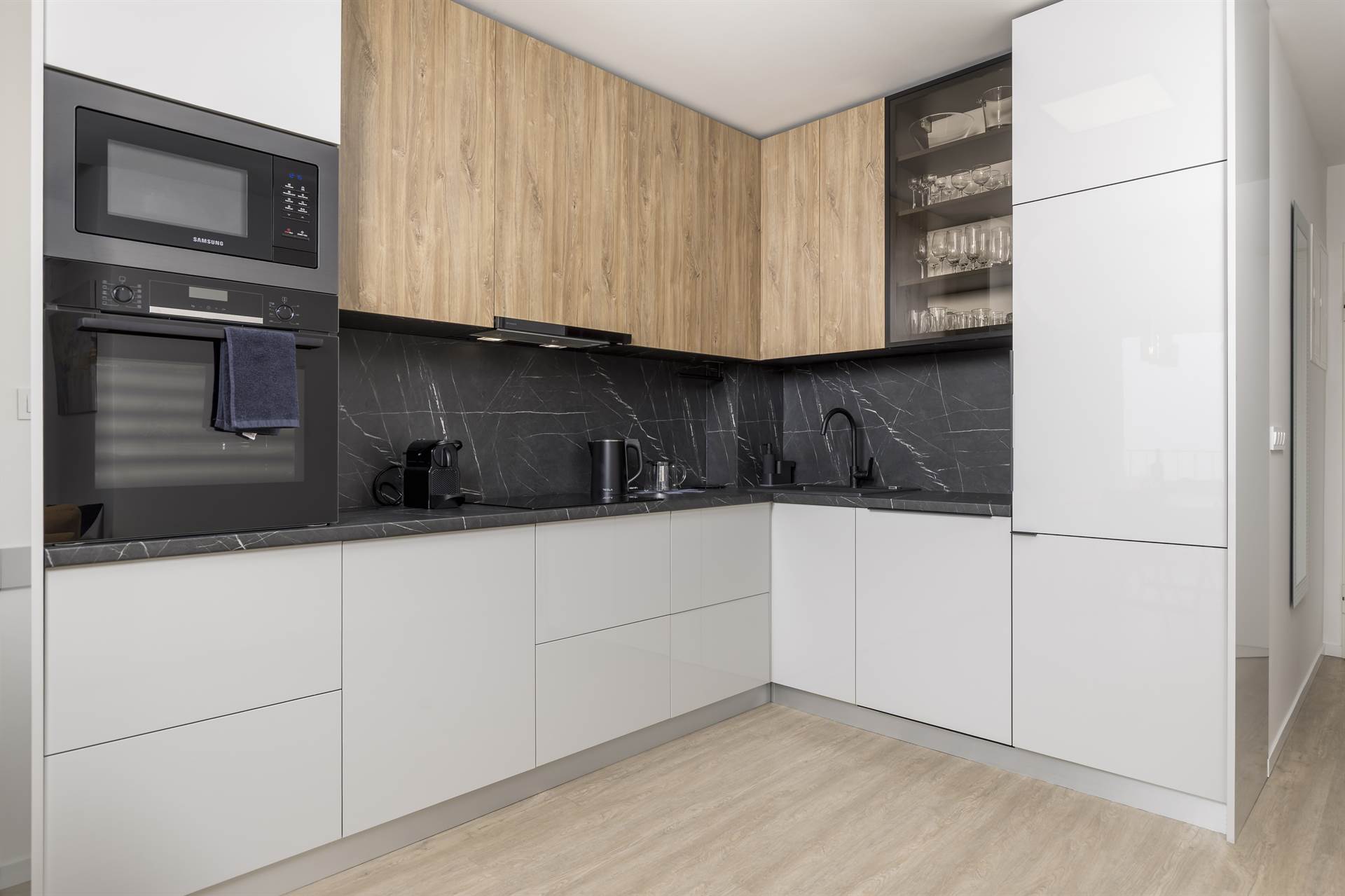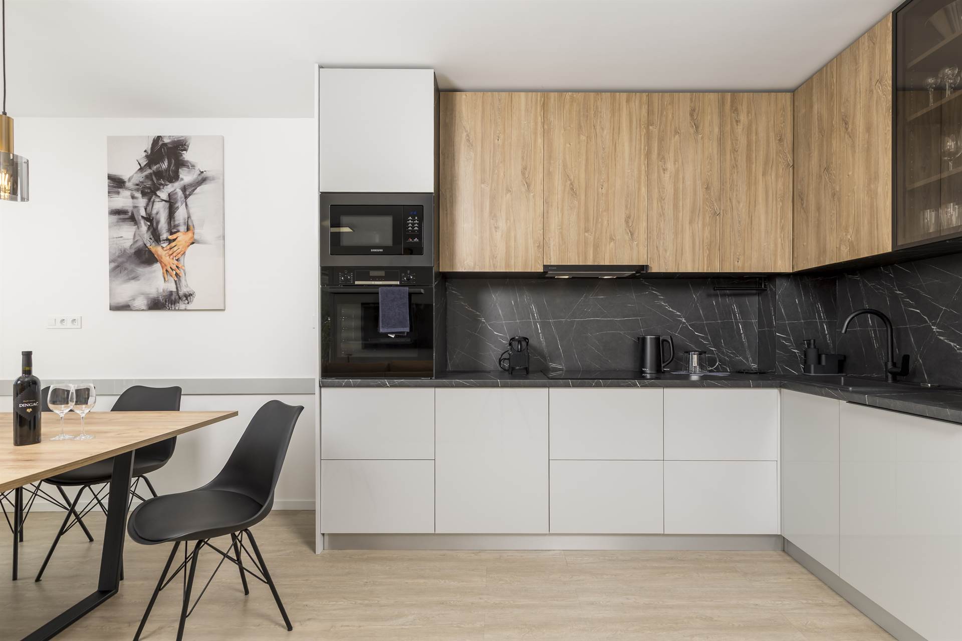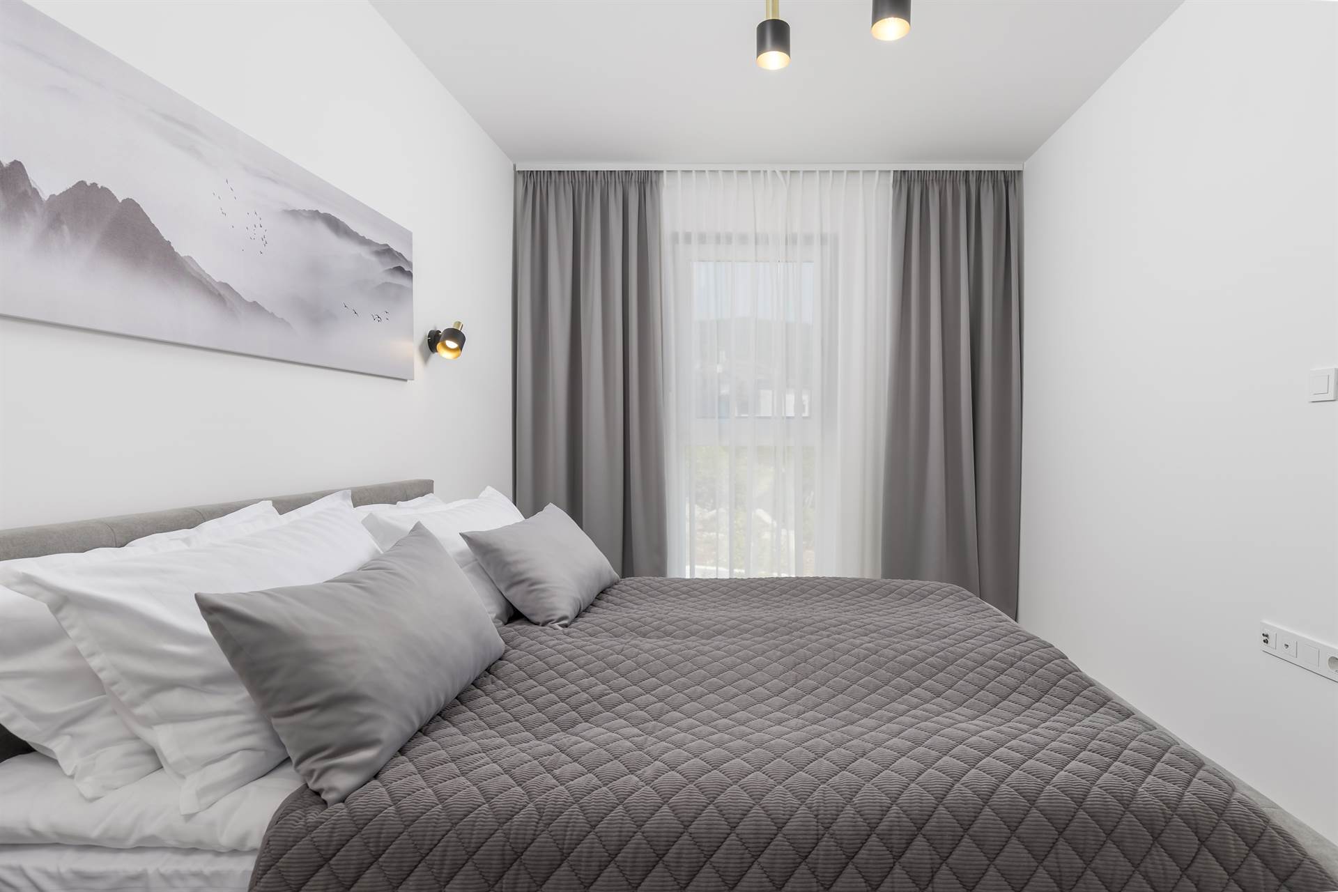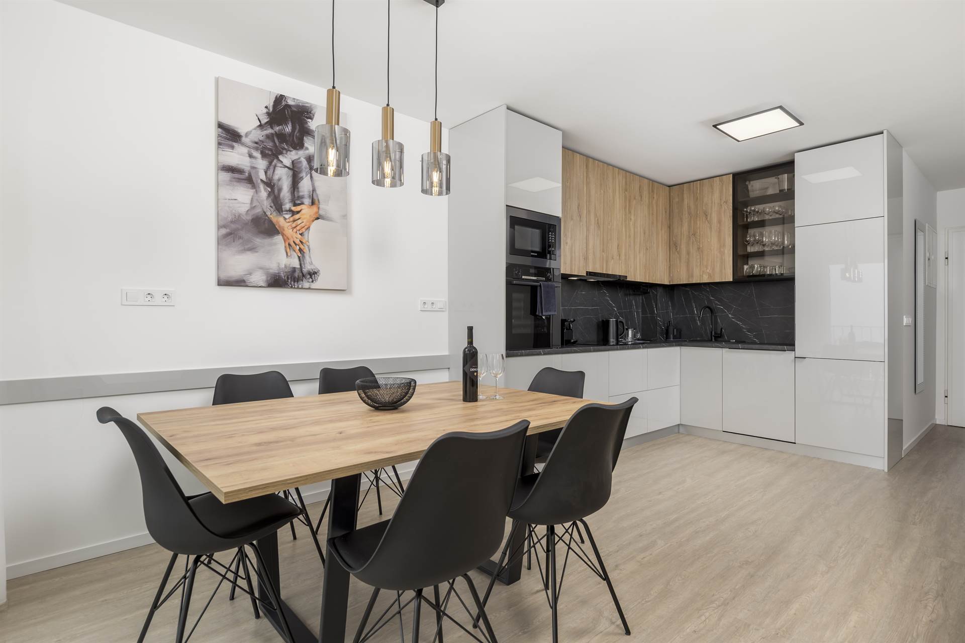 Nekretnina raspolaže s tri spavaće sobe, dvije moderno uređene kupaonice, otvorenim dnevnim boravkom povezanim s kuhinjom i blagovaonicom, te terasom s koje se pruža pogled na more. Apartman je dizajniran s naglaskom na suvremeni stil i udobnost.
